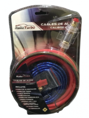 KIT 5 METROS DE CALIBRE 4 + 5 METROS DE CALIBRE 2RCA + 3.8M DE CABLE ALTA VOZ + 1 FUSIBLE REDONDO + CABLE DE TIERRA Y JUEGO DE TERMINALES.